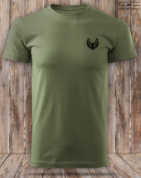 Myśliwska koszulka T-shirt w kolorze khaki z małym łowieckim nadrukiem.