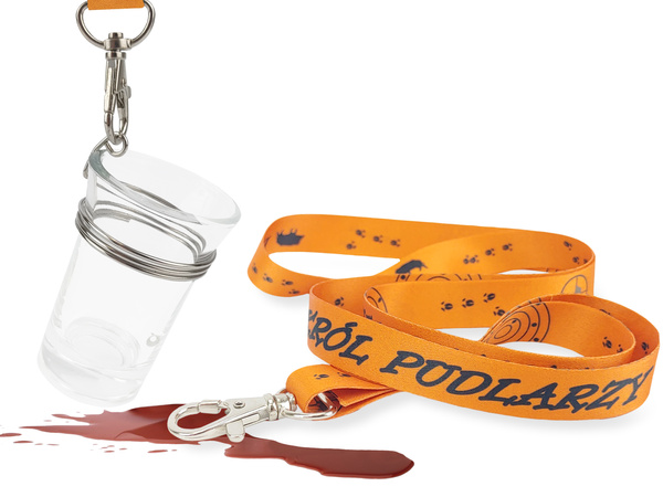 W jego skład wchodzi kieliszek szklany o pojemności 40ml oraz smycz myśliwska z nadrukiem KRÓL PUDLARZY zakończona niklowanym karabińczykiem.
