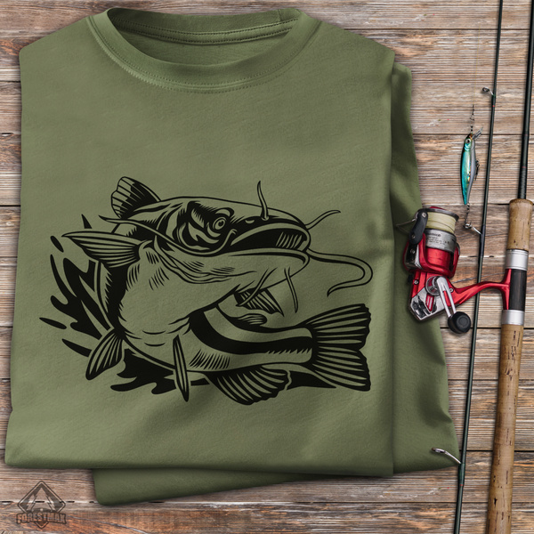 Wędkarska koszulka T-shirt w kolorze khaki z dużym nadrukiem ryby.
